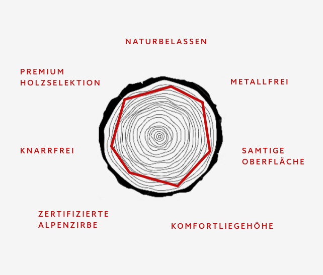 Pure Ästhetik und mehr Zirbenkraft verspricht die Verarbeitungsqualität „Kernholz“ – sie steht für kompromisslose Qualität. Nur das Beste unserer Alpenzirbe wird hier verarbeitet. Das sorgt für eine stimmige und harmonische Optik und mehr Zirbenkraft.