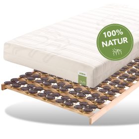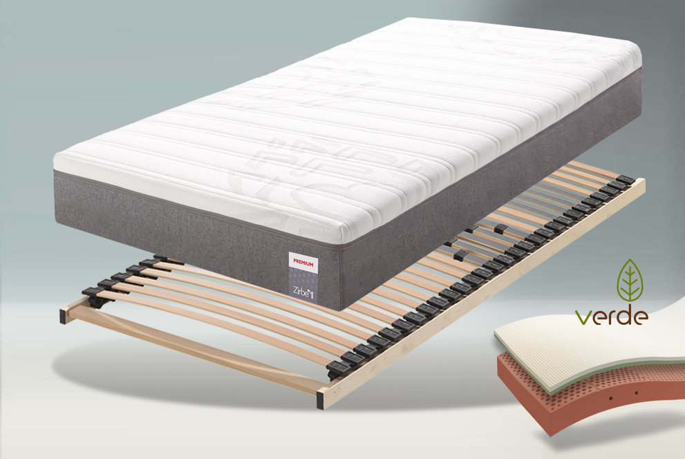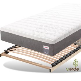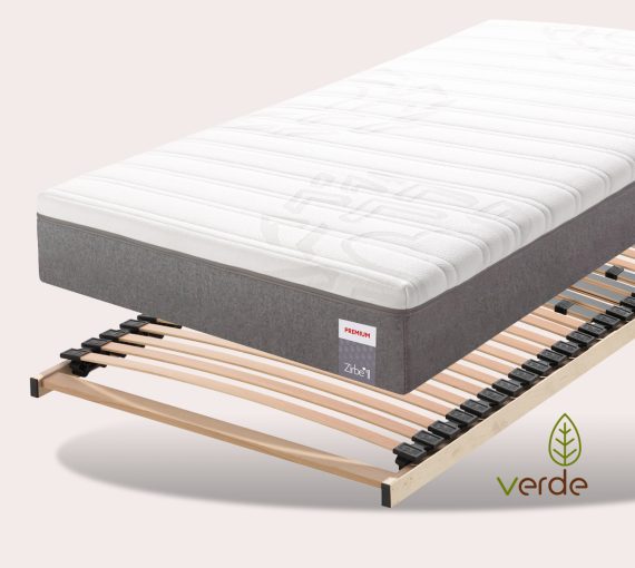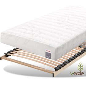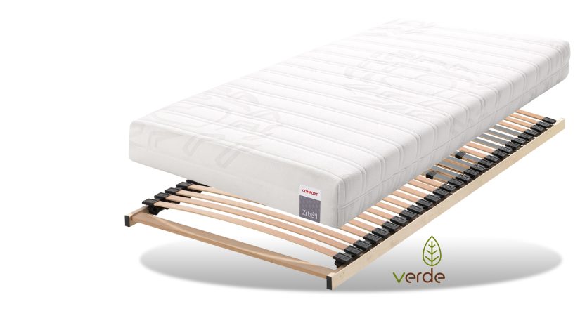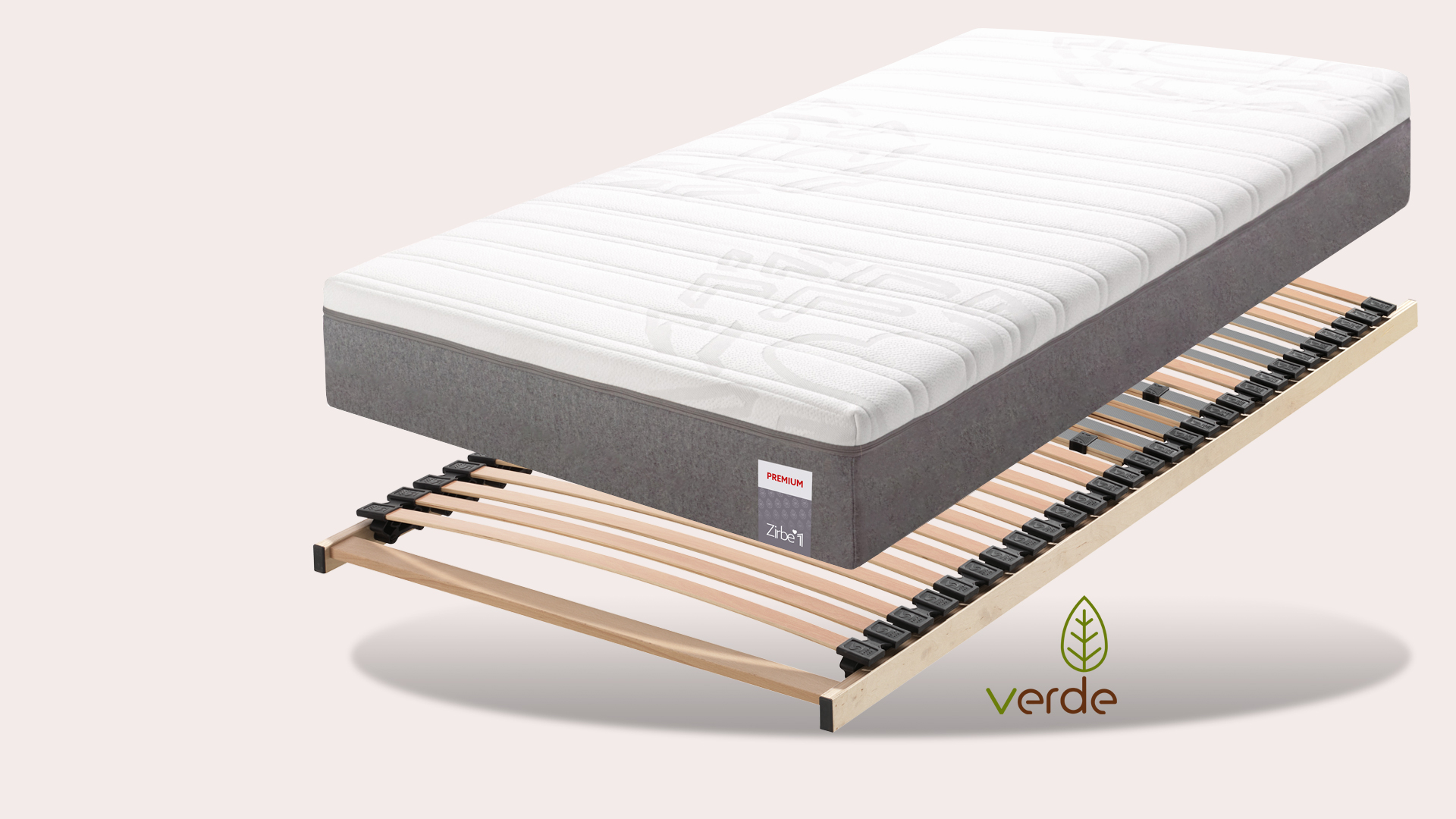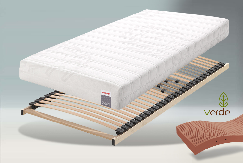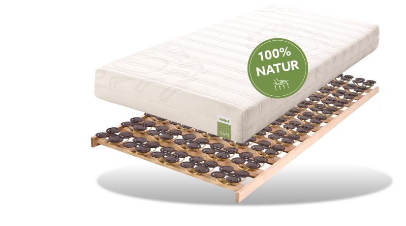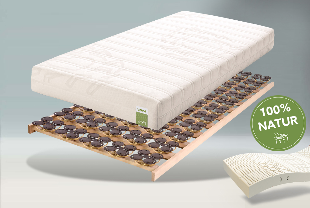Tellerlattenrost VERDE Das Tellerlattenrost sorgt mit 55 flexiblen Kokosfaser-verstärkten Tellern für höchsten Liegekomfort. Die dreidimensional beweglichen Elemente passen sich perfekt dem Körper an und bieten punktelastische Unterstützung – für ein fast schwebendes Liegegefühl. Naturmatratze VERDE Die Naturlatexmatratze VERDE passt sich punktgenau dem Körper an, ist atmungsaktiv, langlebig und schadstofffrei. Der 7-Zonen-Kern sorgt zusätzlich für eine ergonomisch optimale Liegeposition und erholsamen Schlaf.