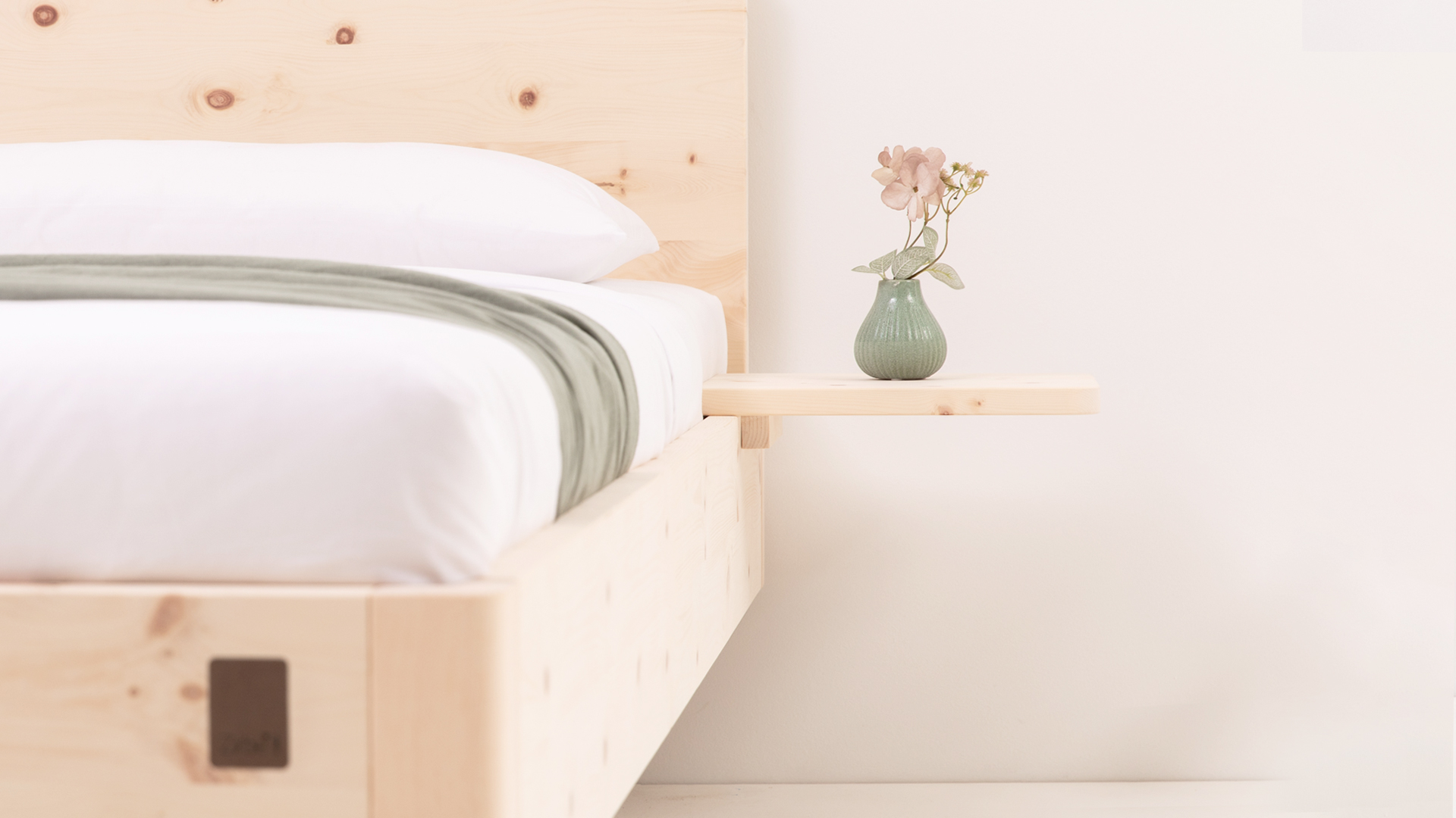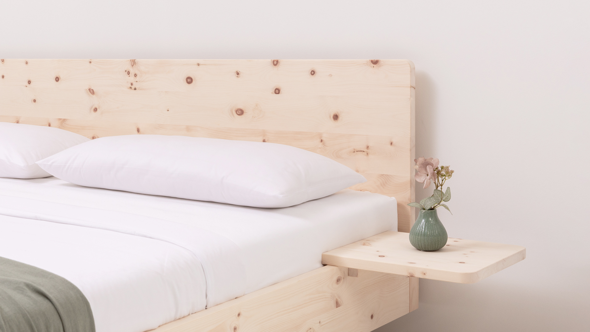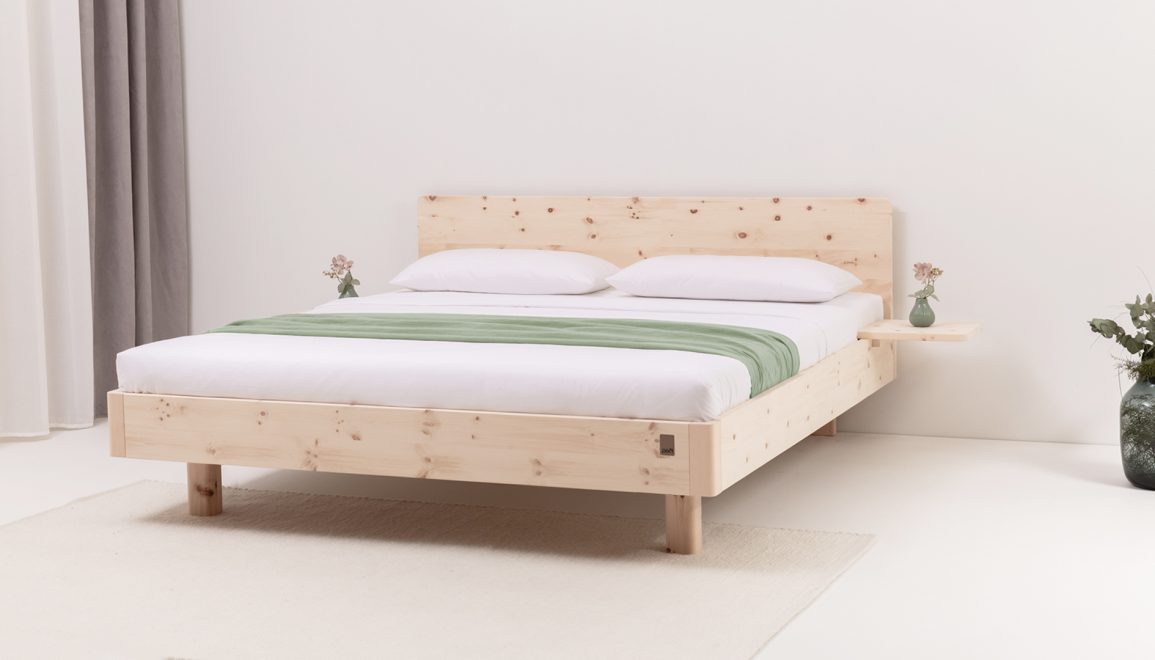 Unser Einstiegsmodell „Die Eins“ verbindet preiswerte Qualität mit zeitlosem Design. Gefertigt aus Splint- und Kernholz der Zirbe, überzeugt es durch Stabilität, schlichte Formgebung und den natürlichen Duft des Holzes – ideal für alle, die gesund und stilvoll schlafen möchten. Nach innen versetzte Bettfüsse verleihen dem Bettmodell "Die Eins" seine schwebende Optik.